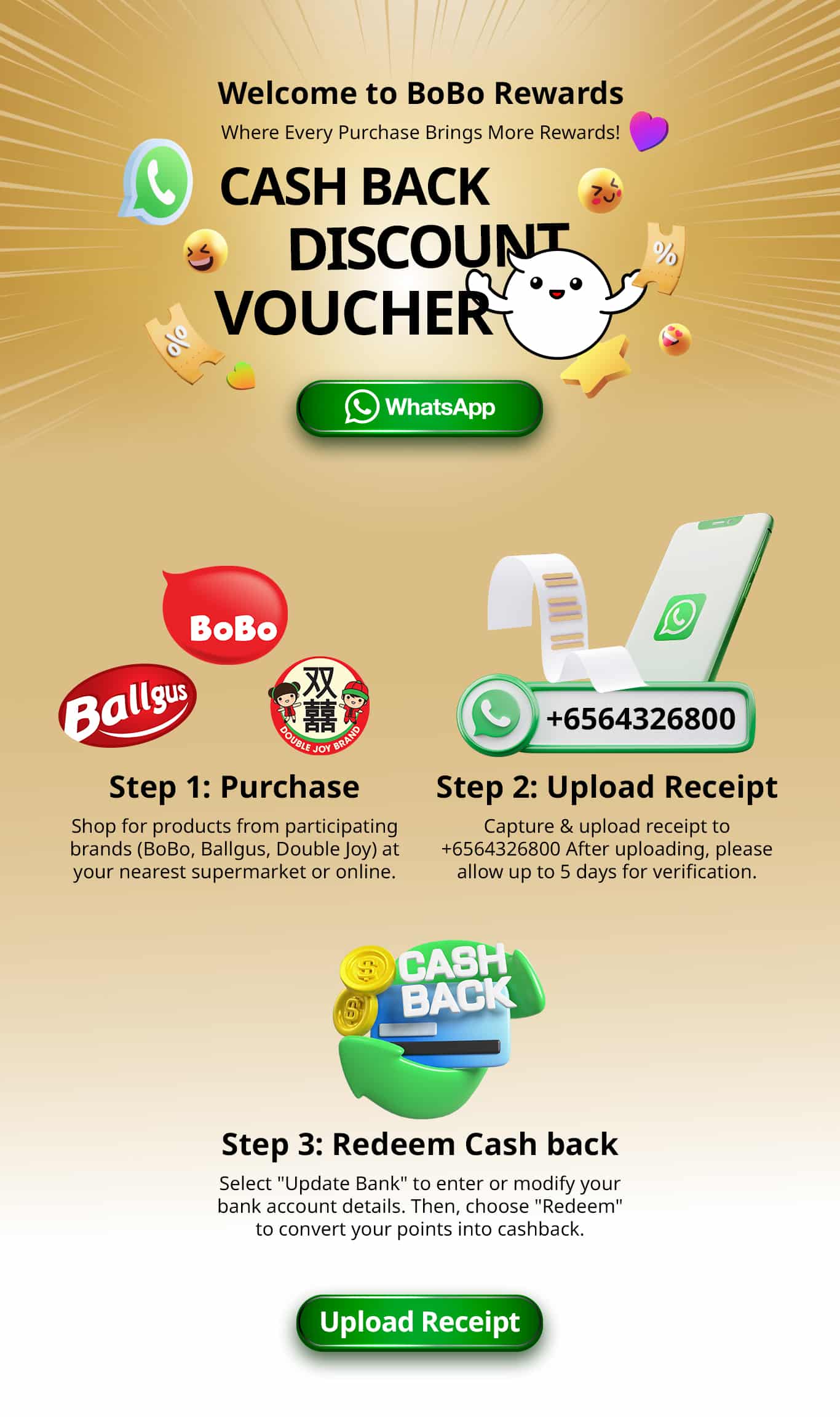 5.2 Participants also agree to receive future marketing communications from BoBo Rewards, including promotional messages via WhatsApp and other channels. Users may opt out of such communications at any time by contacting BoBo Rewards at +65 6432 6800.